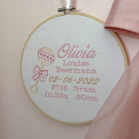 Geborduurde geboorte aankondiging Rammelaar